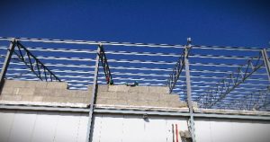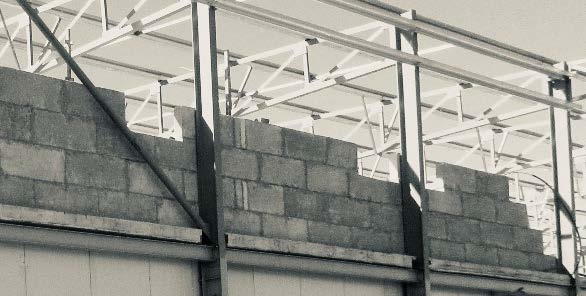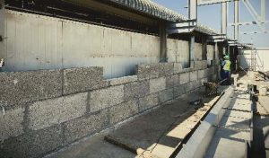 After the construction of the foundation and surface bed or raft, the galvanised light gauge steel bottom channel is fixed to the dust free concrete surface covered with bitumen using 10mm Ø x 80 mm Hilti anchor bolts or chemical anchors at 600 mm centres. A thin layer of tile adhesive is applied at the bottom channel, gluing the bottom modules to the channel. The bottom modules are then alternately staggered to the bottom channel of the outside and inside of the wall modules.