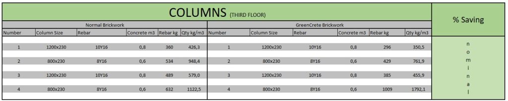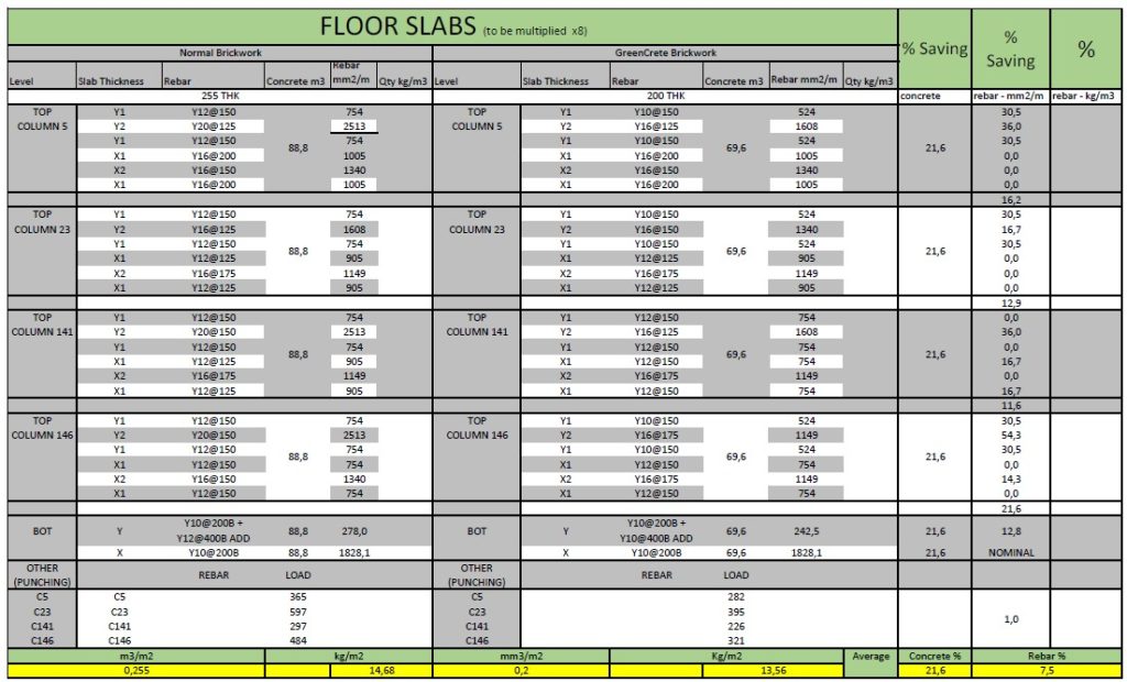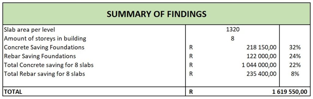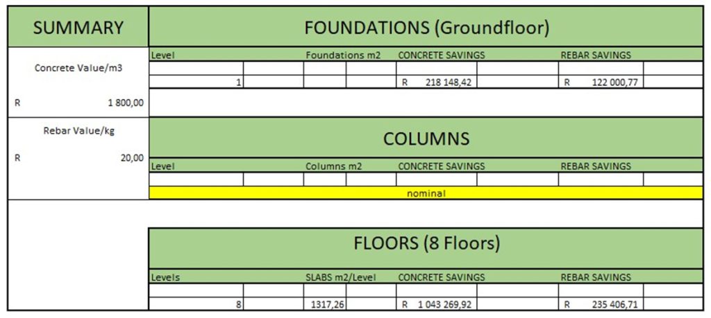 A cost comparison calculation was done on a typical 8 storey building. An estimated saving of 20% or R1 619 550,00 was calculated on the concrete and steel reinforcing as per the calculations & breakdown that follows: