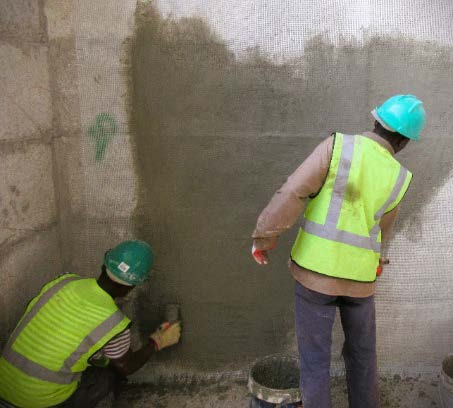 All the external & internal walls are wrapped with sheets of glass fibre mesh secured to the wall with a staple gun(roughly 5 staples per m2). The wall is then “bagged” with a mixture of plaster sand, cement and a bonding liquid. Ensuring that all mesh is covered propperly.